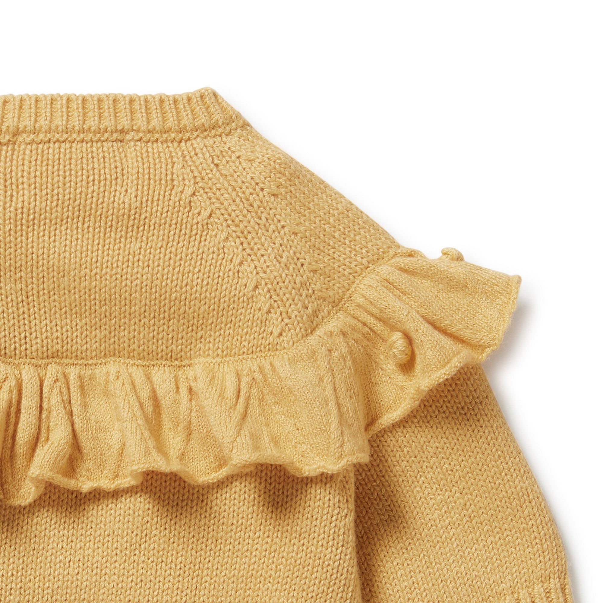 An heirloom piece designed to be passed down, this luxurious knitted ruffle cardigan features a beautiful ruffle detail with baubles. Made from a beautiful blend of Cotton, Bamboo and Wool it's a style you'll want in every colour!