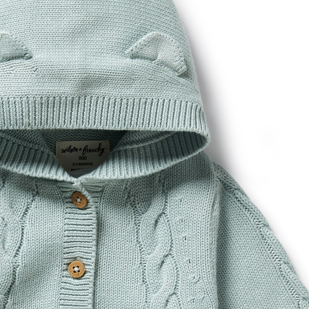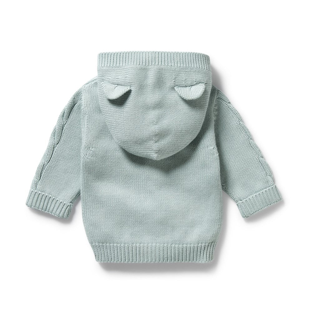 Introducing our cosy knitted jacket with a hood and adorable bear ears. Made of a luxurious blend of organic cotton, bamboo, and wool, this jacket features a button front opening and a cable design on the front. Stay warm this winter with our baby-friendly design.