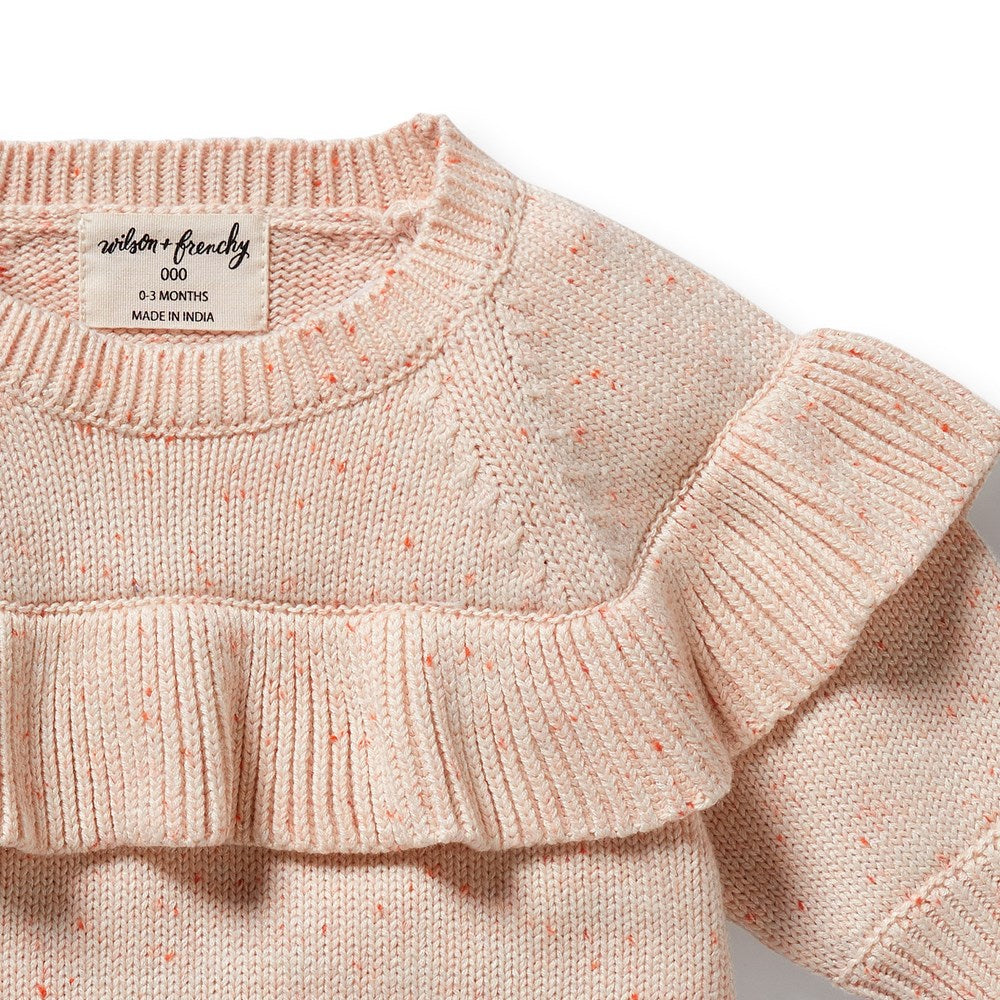 Introducing the ruffle jumper - the perfect combination of warmth and style for both babies and kids. This knitted jumper features a fun and playful ruffle on both the front and back, and its roomy fit ensures comfort for your little ones.