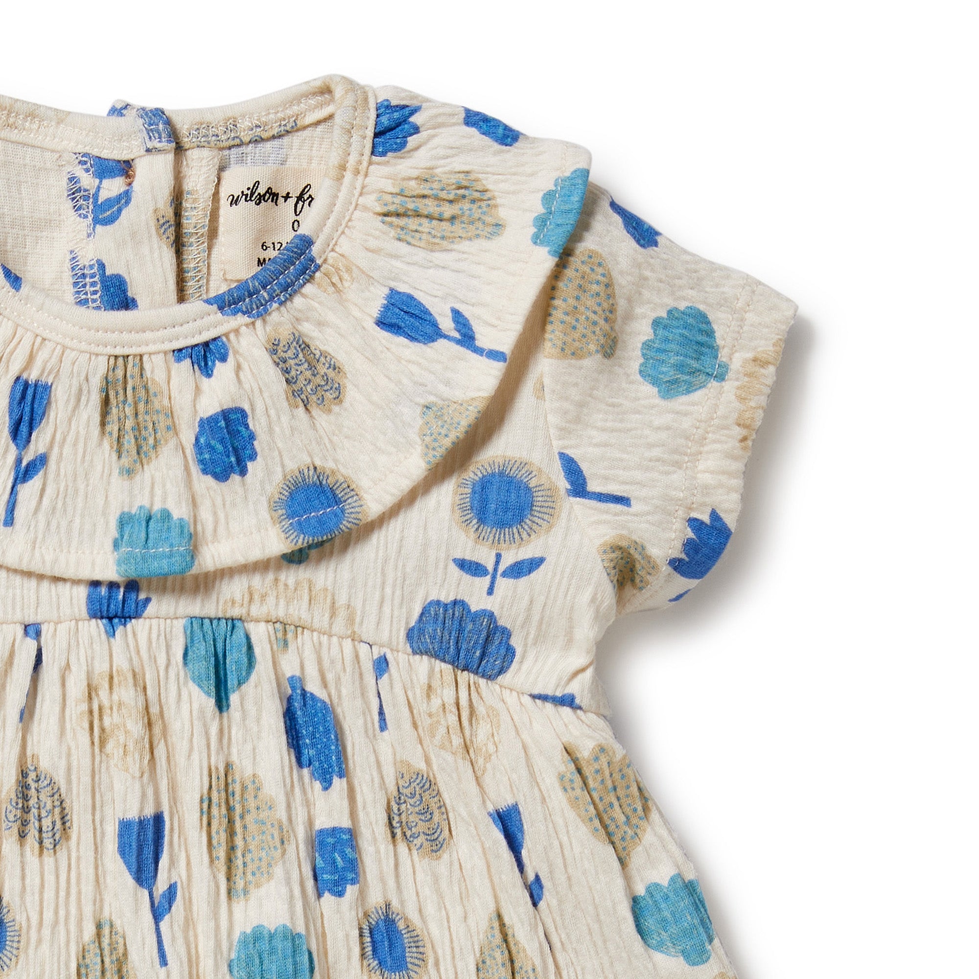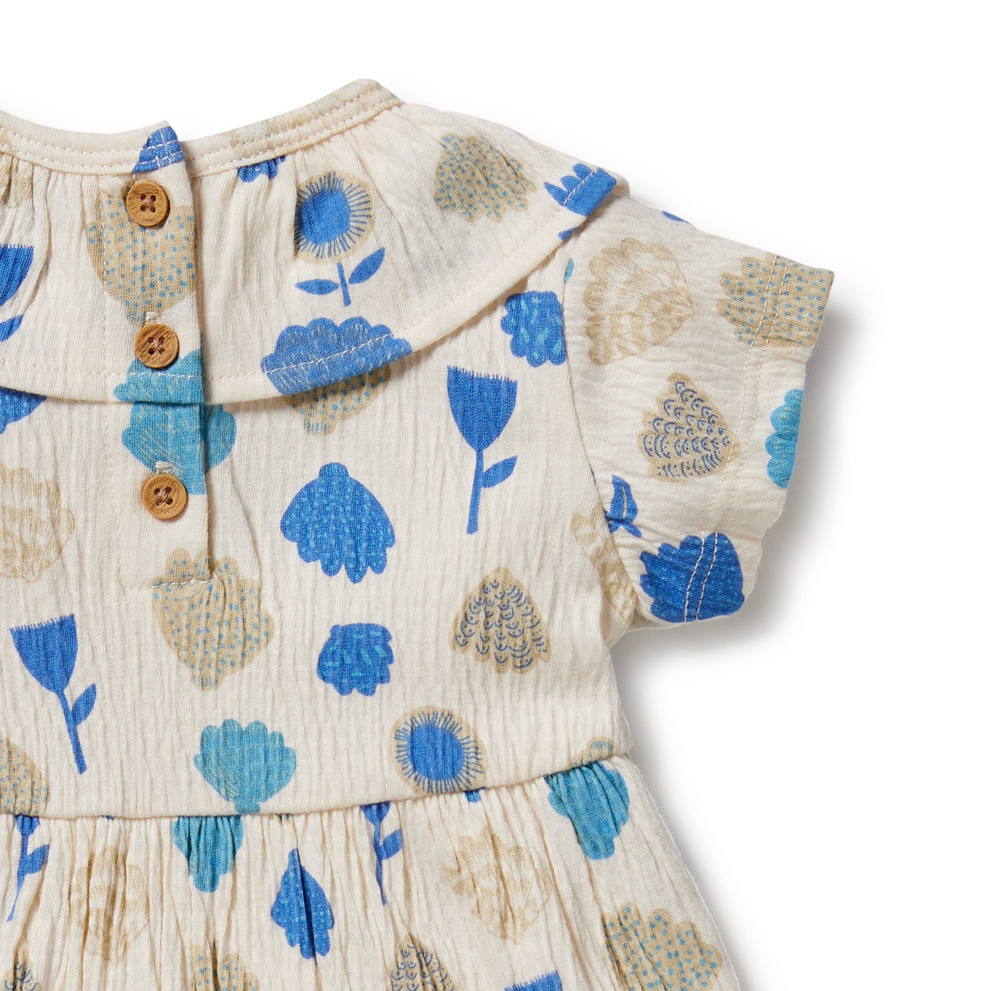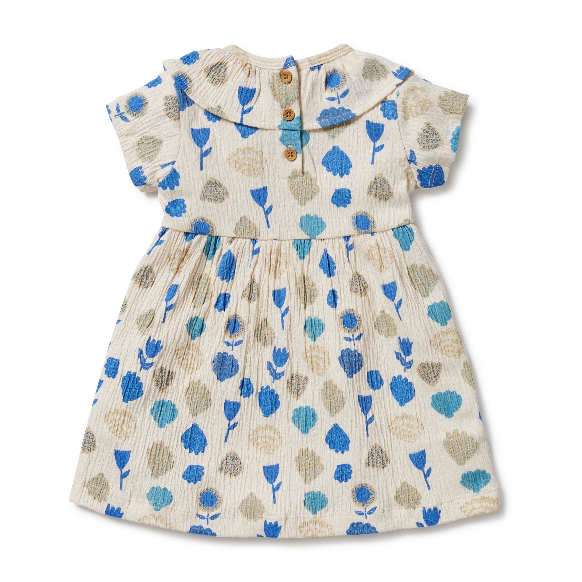 Made from beautiful crinkle cotton, this summer dress is perfect for those sunny and warm days. Mid-length, it features a gathered waistline and, button-through front opening for easy dressing and cap sleeves. This dress is perfect for wearing alone or with a pair of matching nappy pants.