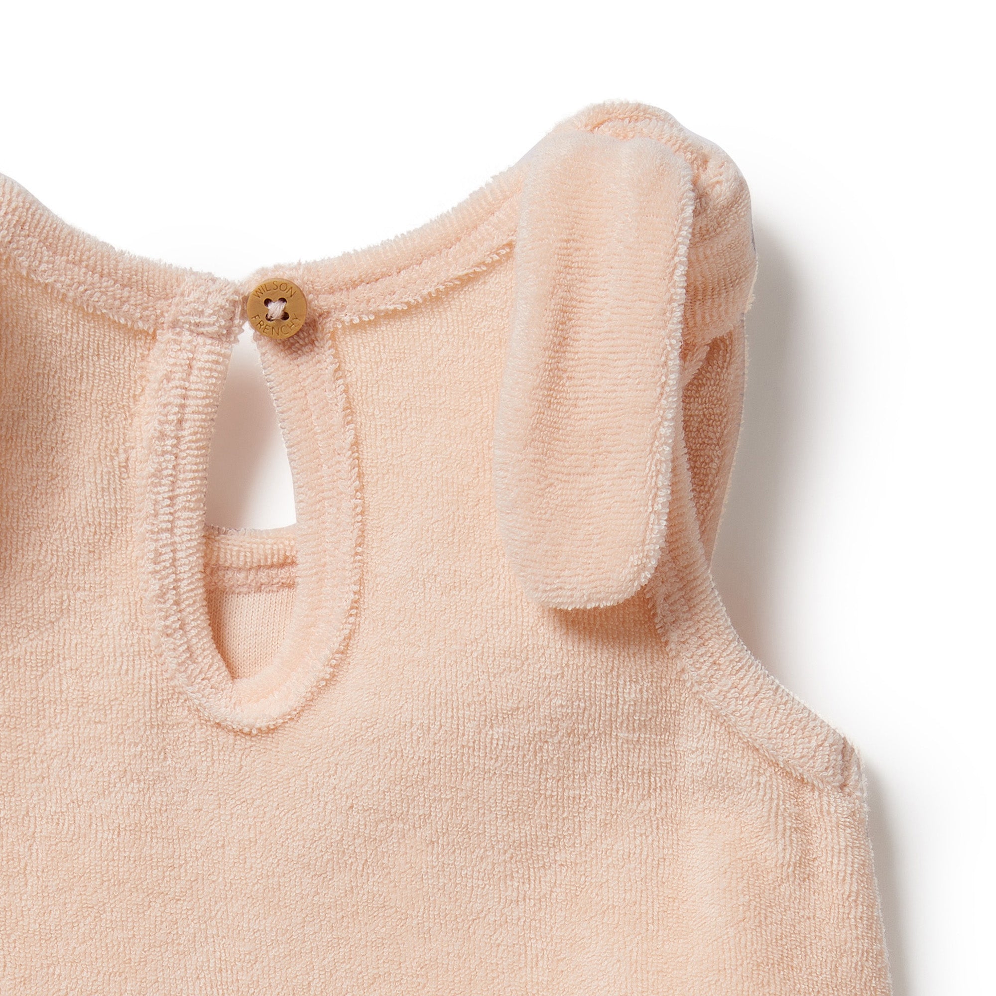 This tie shoulder terry towelling singlet keeps babies cool and comfortable in warmer weather, made from GOTS certified organic fabric. Experience the luxurious softness and absorbency of this baby top, with fixed ties to keep it in place on the beach or during play.